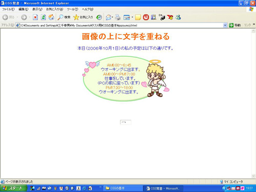 | <HTML> <HEAD> <STYLE type="text/css"> <!-- body { color: #ff6600; background: #ffffff } h1 { text-align: center; color: #ff6600 } div.base { position: relative; /* 文字の位置をずらす距離を指定する基準のボックスにする */ } div.insidefrog { position: absolute; /* 本来表示される位置から外れて、自由な位置に表示させる */ top: 30px; /* class=base画像の上から30ピクセルの位置に表示させる */ left: 50px; /* class=base画像の左から50ピクセルの位置に表示させる */ width: 200px; /* 表示幅を130ピクセルに指定する */ } --> </STYLE> </herd> <BODY> <h1>画像の上に文字を重ねる</h1> <P align="center"><FONT color="#0000ff">本日(2006年10月1日)の私の予定は以下の通りです。</FONT></P> <DIV class="base" align="center"> <IMG src="http://www5b.biglobe.ne.jp/~donbey/MS02_02.GIF" width="353" height="185" border="0"><BR> <div class="insidefrog"> AM6:00〜6;45<BR> <FONT color="#0000ff">ウオーキングに出ます</FONT>。<BR> AM8:00〜PM17:00<BR> <FONT color="#0000ff">仕事をしています。<BR> (PCの前に座っています)</FONT><BR> PM17:30〜18:00<BR> <FONT color="#0000ff">ウオーキングに出ます。</FONT> </div> </div> </body> </HTML> |